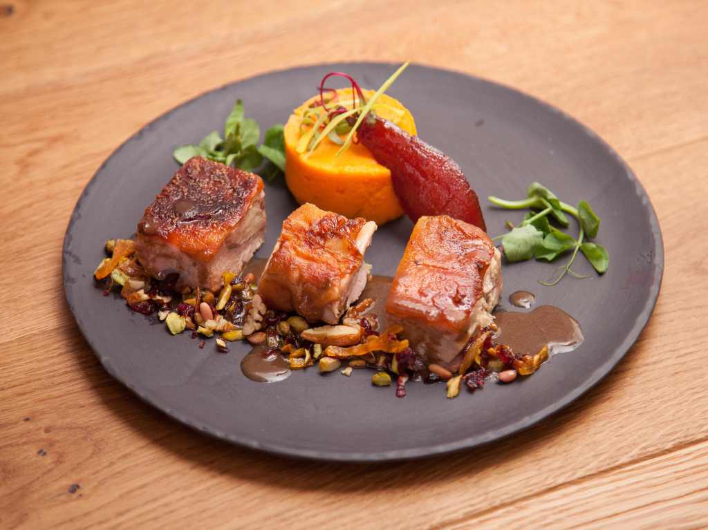 Comida “mexi-terránea, así nombró el afamado chef Guy Santoro su concepto dispuesto en el restaurante abierto en la planta baja del hotel Galería Plaza Reforma, donde los ingredientes nacionales —aguacates, tomate, chiles secos y hierbas de olor— se integran a recetas tradicionales de Francia, Italia, España y el norte de África. Para lo anterior dispone de una pasta con camarones, calabaza, pesto y jitomate cherry, o su lechón lechal confitado con frutos secos, pera al vino tinto, camote y apio confitado.