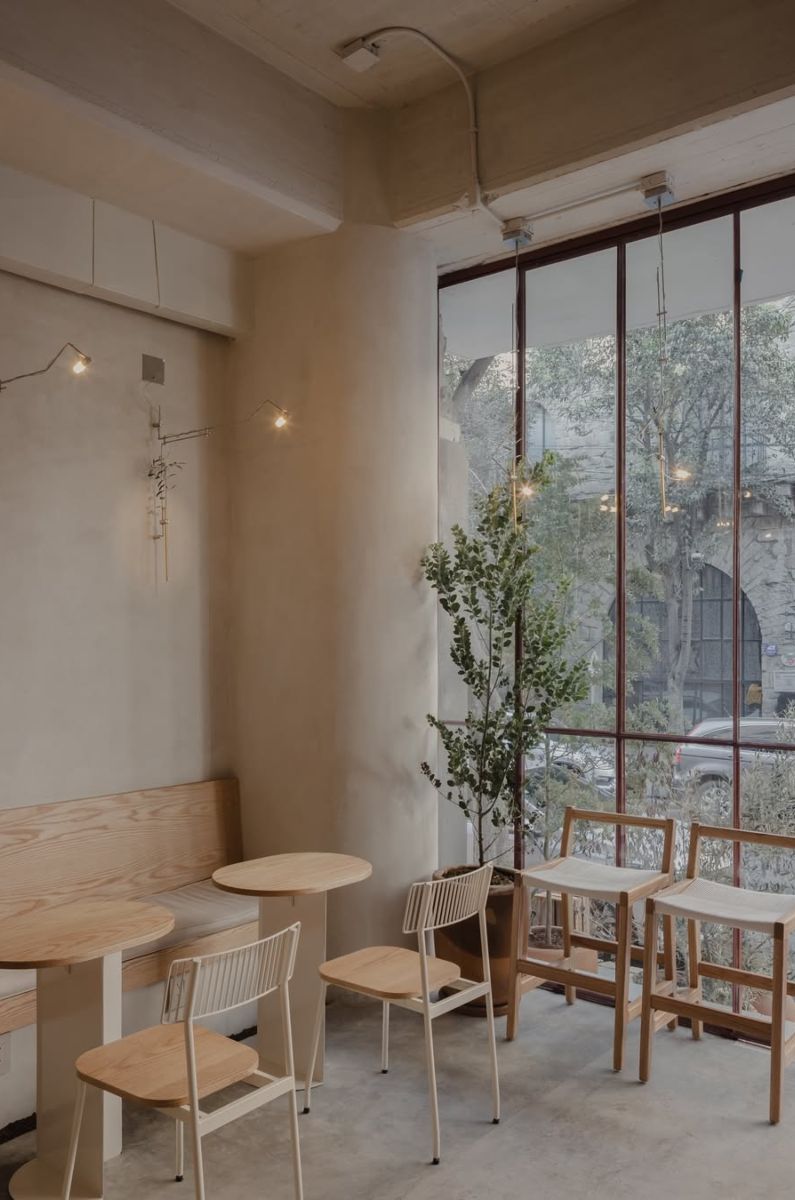 El espacio es modesto, ni muy grande ni muy pequeño, donde claramente destaca su diseño, con paredes en crudo donde predomina la luz cálida, un mobiliario de madera, así como sutiles detalles en anaranjado que aportan un toque de color tanto en lámparas y ventanales.