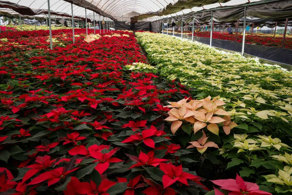 Aquí encontrarás nochebuenas en variedades roja tradicional, blanca, jaspeada, rosa, amarilla, anaranjada y morada, todas cultivadas de manera local por familias dedicadas al campo.